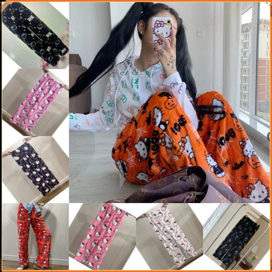 Anime Sanrioed Hellokitty Y2K Sanrioed Pajamas Pants Women Pjs Halloween Household Dress Kawaii Woolen Cartoon Casual Home Pants